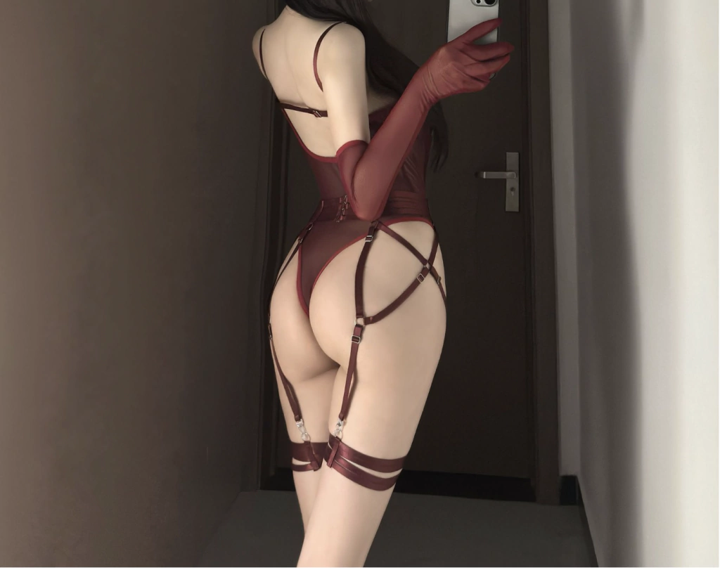 El Body Cherry es un body de malla transparente color bordó que incluye guantes, portaligas y ligas a juego que completan un look hot y seductor 💋