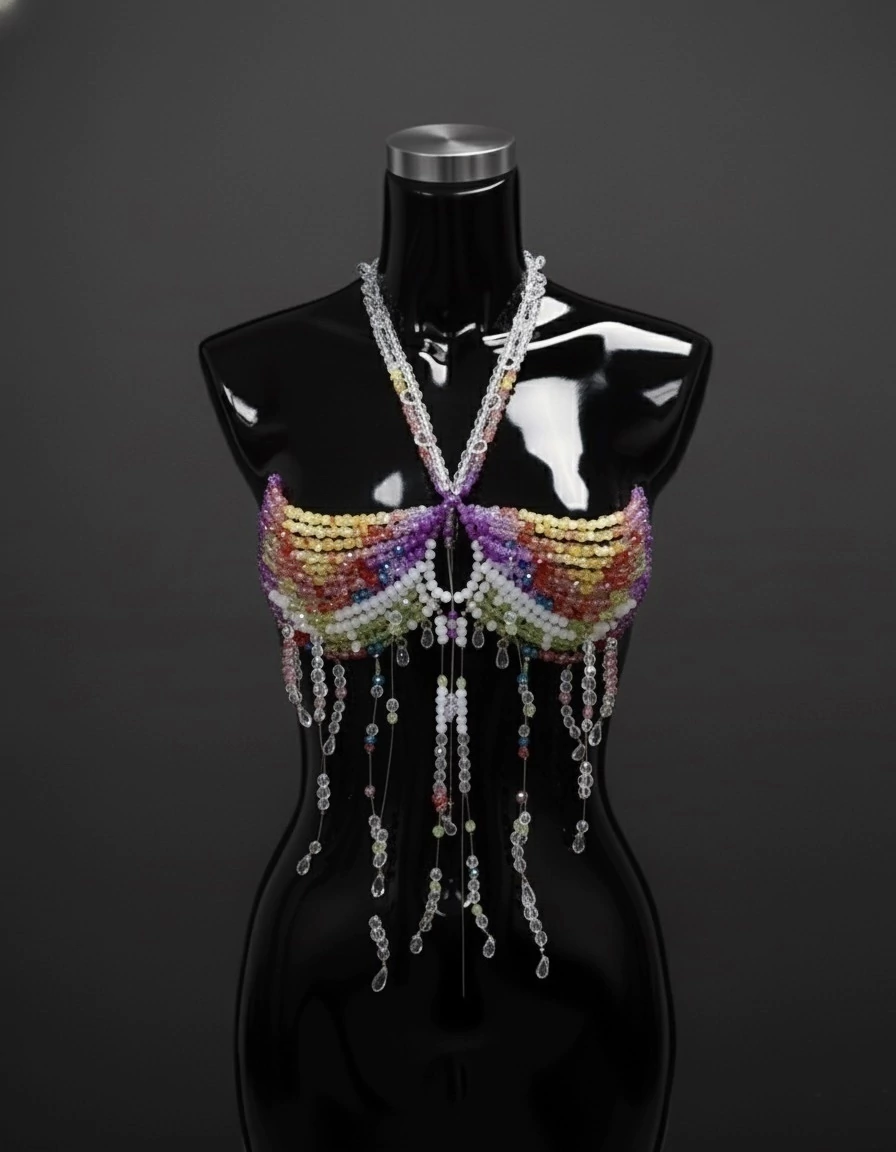 Hecho a mano con mostacillas de todos los colores, nuestro corpiño tipo top es ideal para destacar y llamar la atención en un festival, brillar bajo el sol o deslumbrar en cualquier fiesta. Cada detalle refleja la dedicación y el arte que lo convierten en una prenda única.