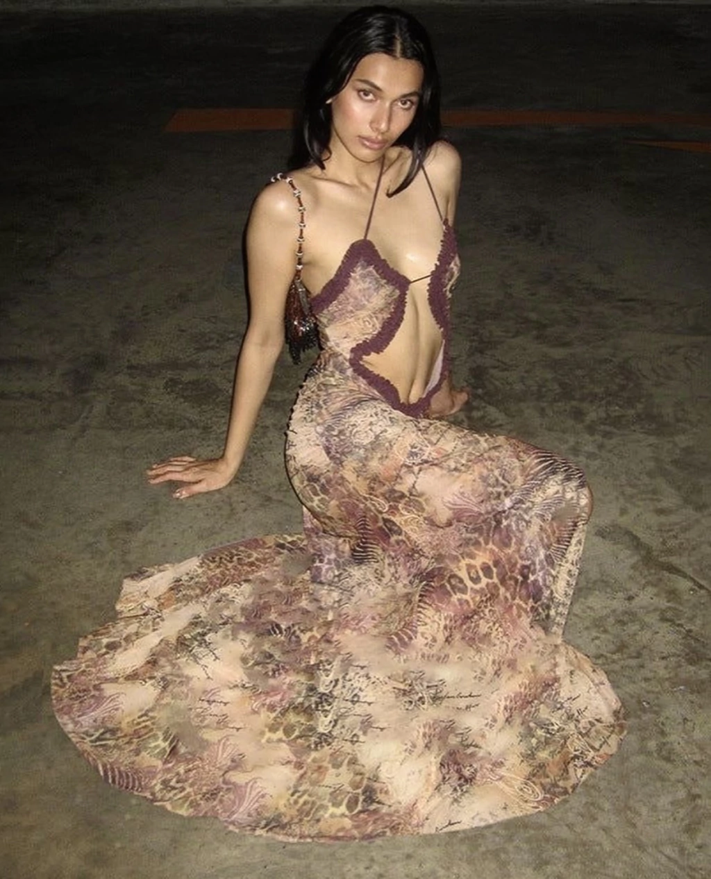 Vestido deslizante de longitud de suelo, con diseño de corte, tirantes halter, estampado de animales abstractos y ribete con volantes.