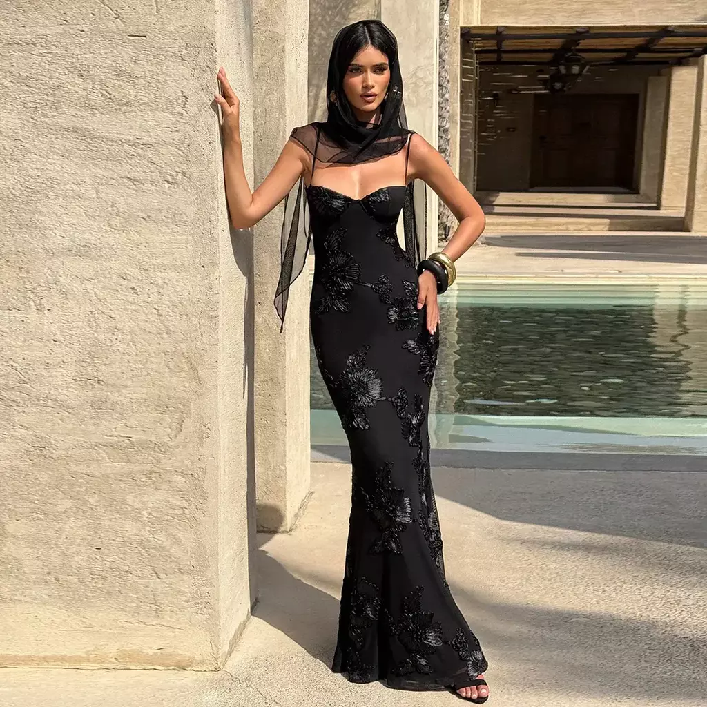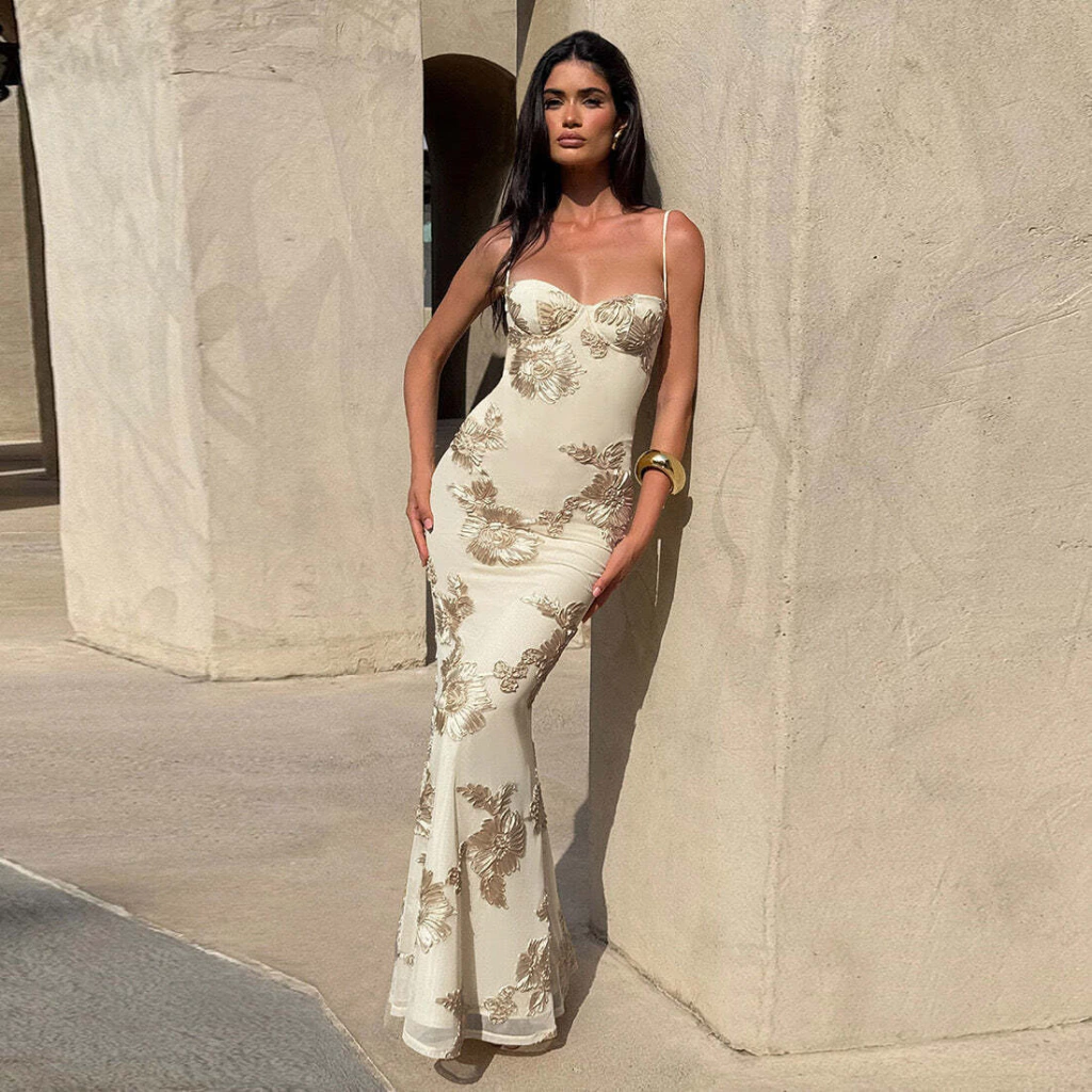 Descubrí nuestro vestido largo con caída tipo sirena, diseñado para realzar tu figura con elegancia. Cuenta con cintas de breteles que se atan, una espalda abierta con cruces que aporta un toque sensual.