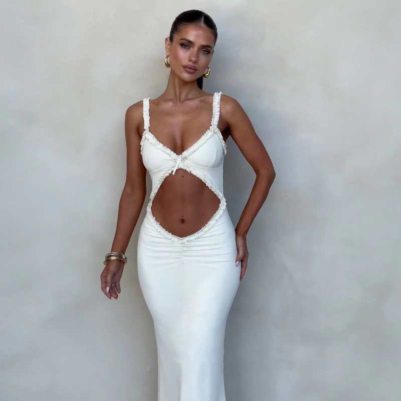 Descubrí el Vestido Doll, la mezcla perfecta entre delicadeza y sensualidad para resaltar tu silueta de manera única. Este vestido largo, ajustado y con un cut-out frontal súper canchero, tiene un detalle de moñito en el busto que le da un toque re femenino <3