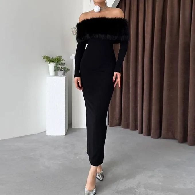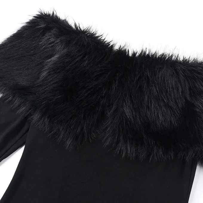 La prenda incluye una piel sintética suave y abrigada que cubre las mangas, brindándote confort y un detalle distintivo que eleva su elegancia. Este vestido es la combinación perfecta entre sofisticación y comodidad, diseñado para quienes buscan un look impactante y refinado.