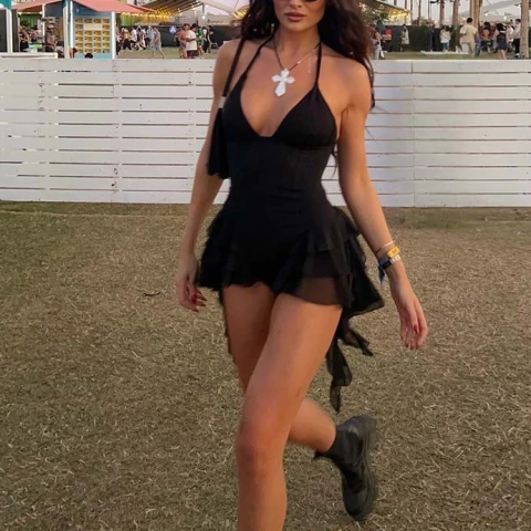 Su diseño con cuello halter realza el contorno del cuello y los hombros, aportando un toque sensual y refinado. Los volados colgantes son el detalle distintivo que le otorga una caída diferente y atractiva, creando un movimiento fluido y encantador al caminar.